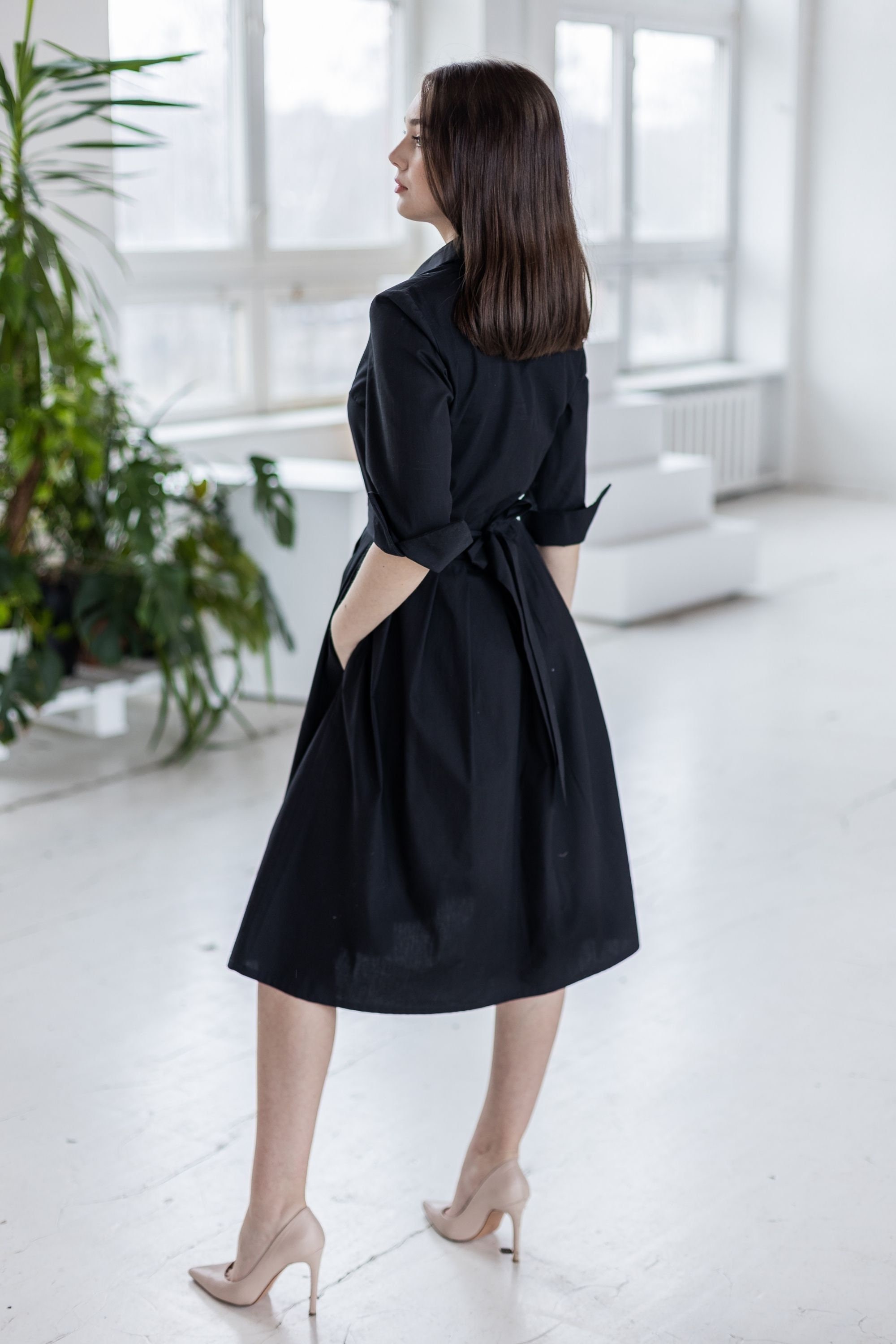 The dress has a collar and buttons on the front of the chest